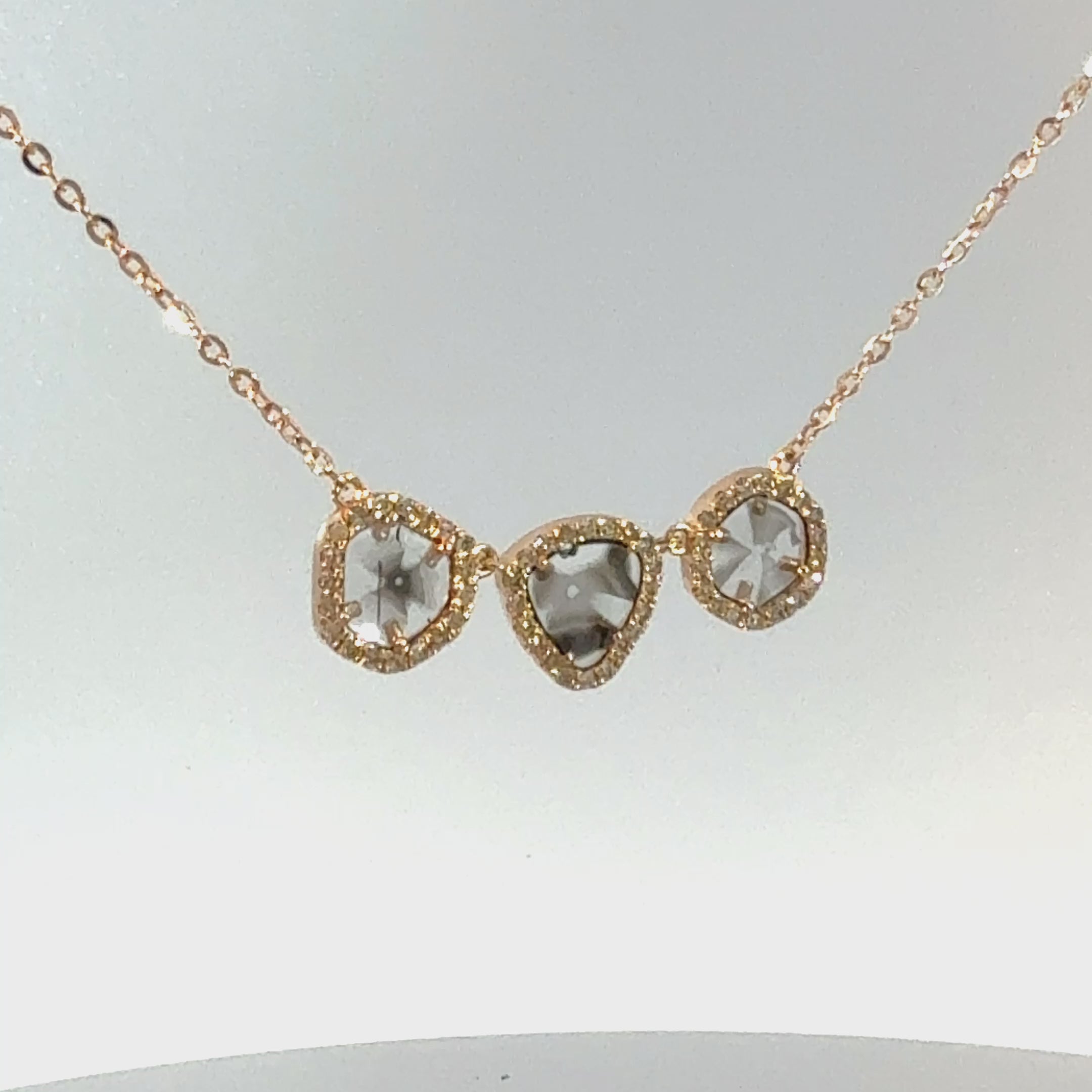 Exquisite 14K rose gold necklace, featuring three brilliant diamond slices, each surrounded by small full cut diamonds to add sparkle to the flash. Chain is 18" and adjustable to two shorter lengths. Also available in white gold.